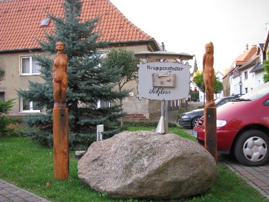 Anläßlich dem 20.Jahrestag der Wiedervereinigung am 03.Oktober 2010 hat das Kroppenstedter Schloß Zuwachs bekommen. Zwei Holzfiguren, die diese Schloß jetzt bewachen. Schnitzereien, de gestifftet wurden. Genaueres wird grad recherchiert und natürlich hier dann nachzulesen.