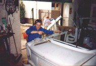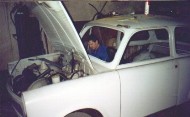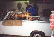 Dann konnte es im Herbst 1994 losgehen. Mein bester Kumpel und Autoschlosser Lutz legt erste Hand an den Trabbi. Das Dach muß fachgerecht entfernt werden und 70 kg Stahl werden als Käfig eingeschweißt.